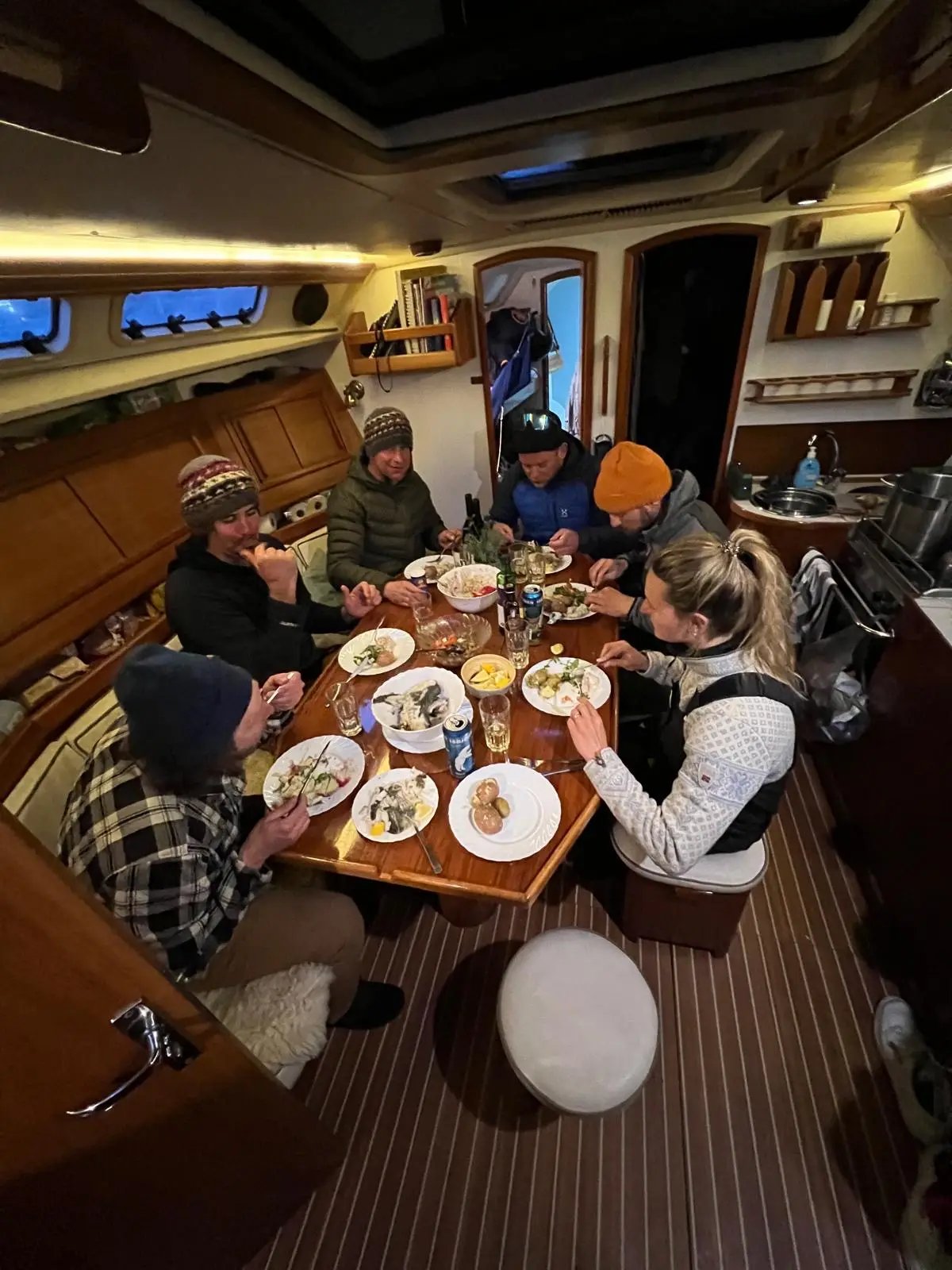 Tagsüber erwartet dich Pulverschnee in wilder Landschaft, abends gutes Essen, gemütliche Stunden an Bord – und mit Glück das Schauspiel der Nordlichter.