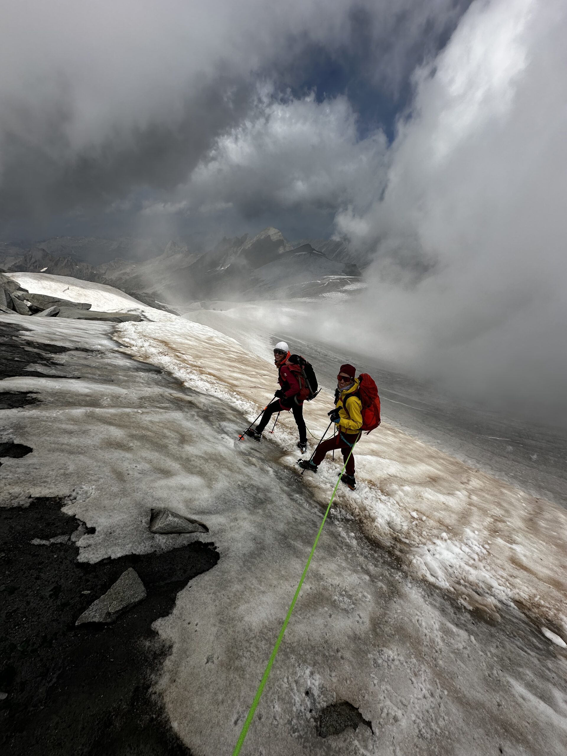 Gipfelaufbau: Über Firn und Blockgrat – letzte Meter leicht ausgesetzt, aber gut machbar